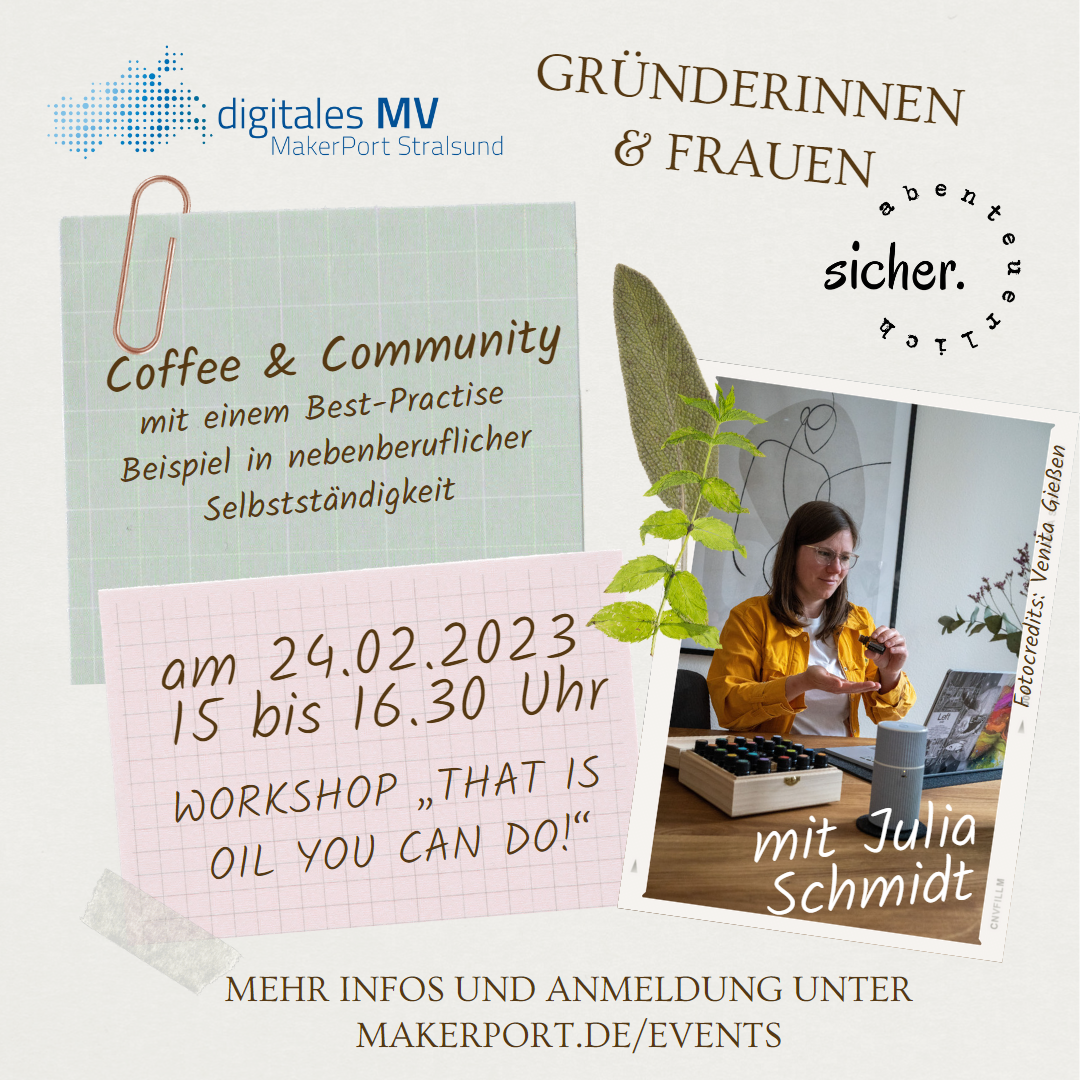 Komm zu unserer Kaffeerunde und tausche dich mit anderen Frauen und Gründerinnen aus! Dieses Mal wird Julia über ihre nebenberufliche Selbstständigkeit berichten und zusätzlich einen Workshop geben. Tatsächlich wird es diesmal keinen Kaffee geben, lass dich überraschen, warum nicht und was wir so mit dir vorhaben!